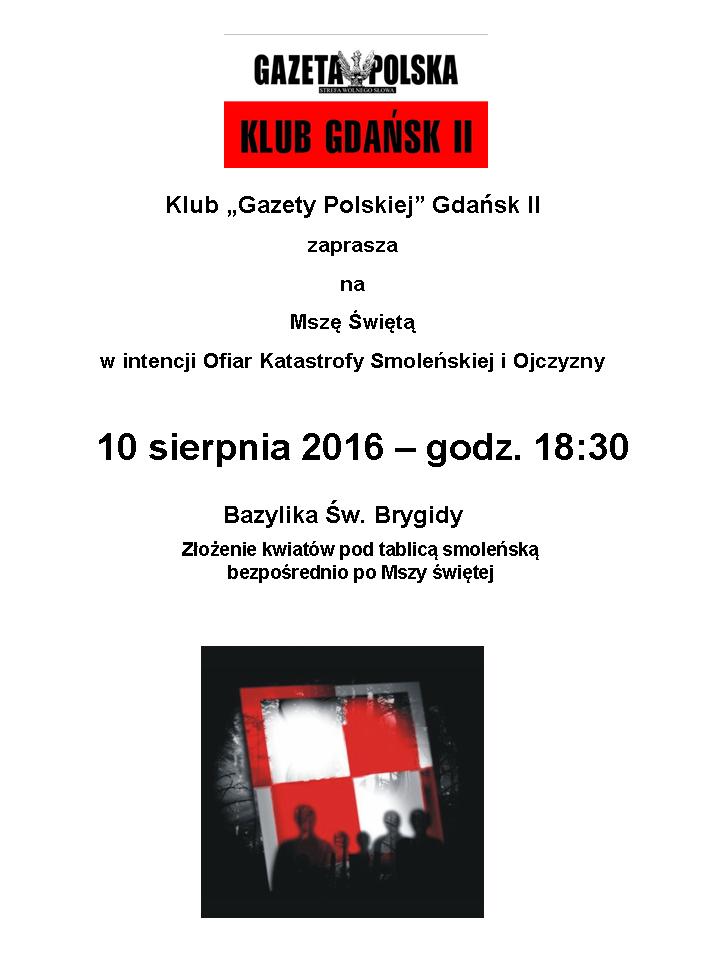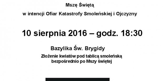 Gdańsk II – Msza Św. w intencji Ofiar Katastrofy Smoleńskiej i Ojczyzny, 10 sierpnia, g. 18.30, Bazylika Św. Brygidy. Po Mszy św. złożenie kwiatów pod tablicą smoleńską.