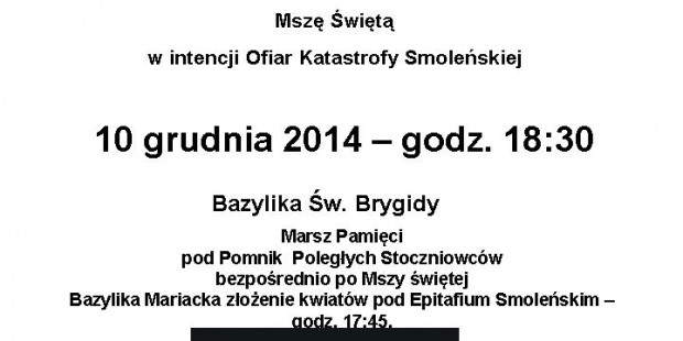 Gdańsk II – Msza św. w intencji Ofiar tragedii smoleńskiej, 10 grudnia Gdańsk II – Msza św. w intencji Ofiar tragedii smoleńskiej, 10 grudnia, g. 18.30, Bazylika św. Brygidy. Marsz Pamięci pod Pomnik Poległych Stoczniowców bezpośrednio po Mszy św. gru 10, 2014 Kluby GP Gdańsk II Tagged Gdańsk II, Marsz, Miesięcznice, Obchody, Tragedia Smoleńska Wstecz Bydgoszcz – „W obronie demokracji i wolności mediów” – Konferencja Prasowa Dalej Apel – 10 grudnia 2014 r.