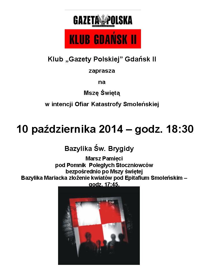 Gdańsk II – Msza św. w intencji Ofiar tragedii smoleńskiej, 10 października Gdańsk II- Msza św. w intencji Ofiar tragedii smoleńskiej, 10 października, g. 18.30, Bazylika św. Brygidy. Marsz Pamięci pod Pomnik Poległych Stoczniowców bezpośrednio po Mszy św. paź 7, 2014 Kluby GP Gdańsk II Tagged Gdańsk II, Marsz, Miesięcznice, Obchody, Tragedia Smoleńska Wstecz Organ do myślenia, na cztery litery Dalej Antoni Macierewicz w Konstancinie, 16 października