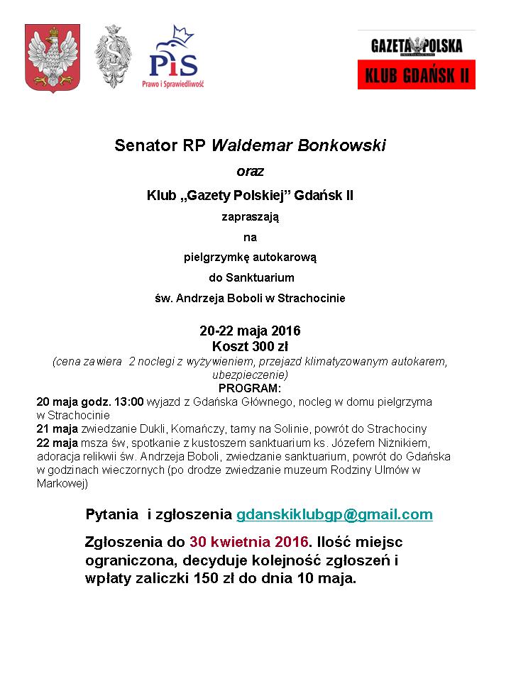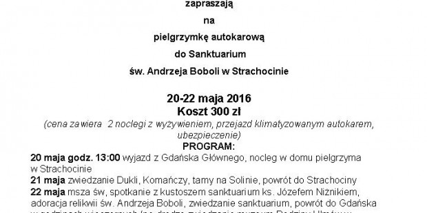 Gdańsk II – pielgrzymka autokarowa do Sanktuarium św. Andrzeja Boboli w Strachocinie, 20-22 maja