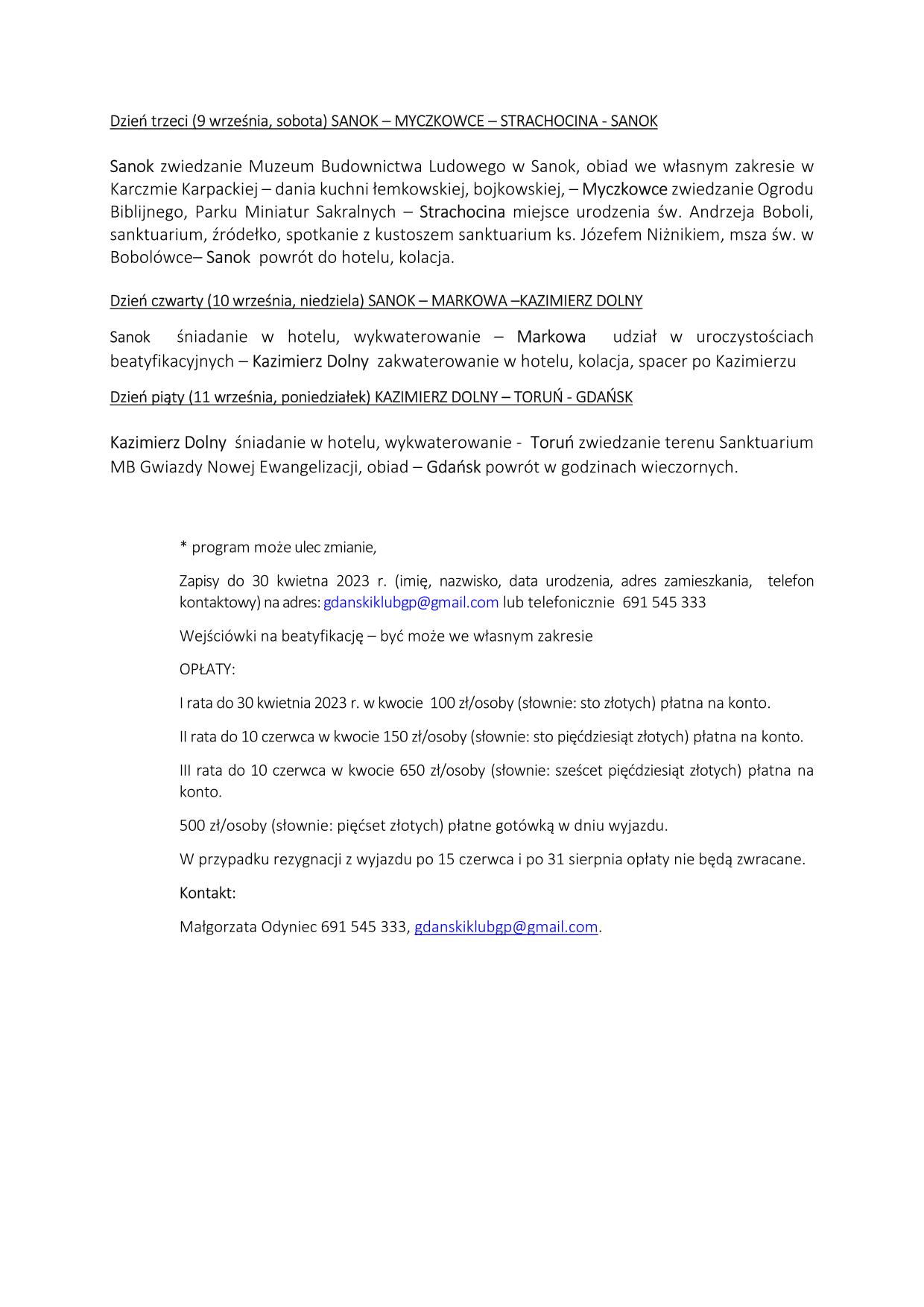 Zachęcam do wyjazdu z nami. Program w załączeniu.