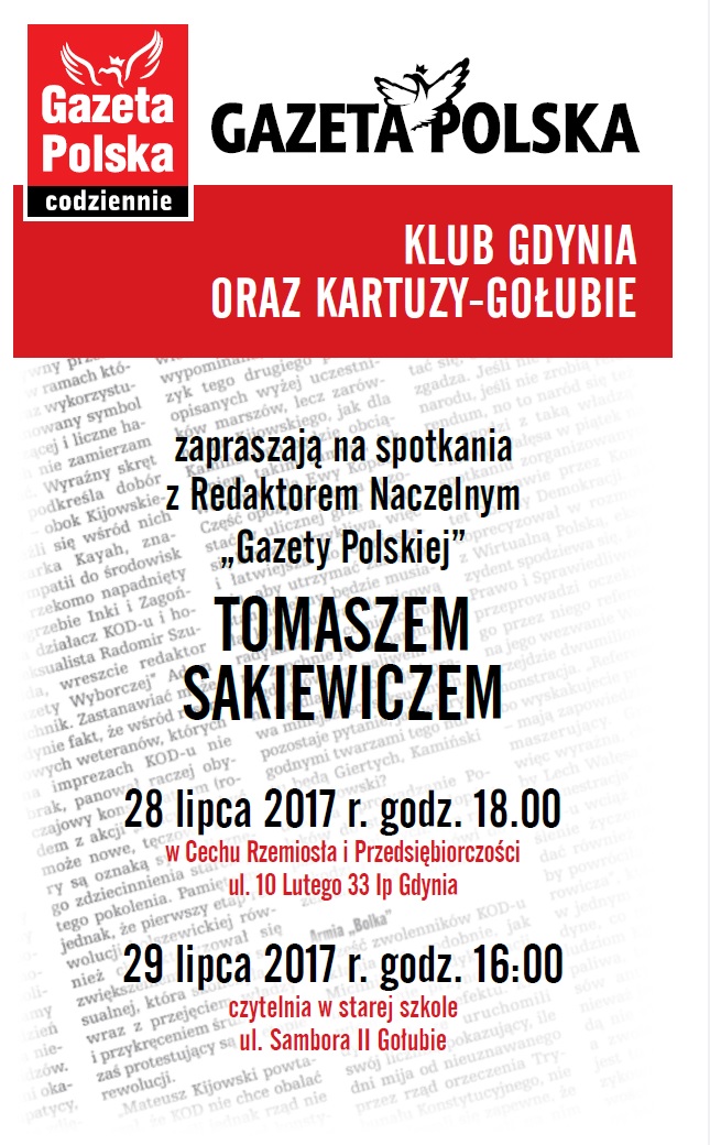 Gdynia – spotkanie z red. nacz. „Gazety Polskiej” Tomaszem Sakiewiczem, 28 lipca, g. 18, w Cechu Rzemiosła i Przedsiębiorczości Gdynia, ul. 10 Lutego 33 Ip. Zaprasza Klub „Gazety Polskiej” w Gdyni.