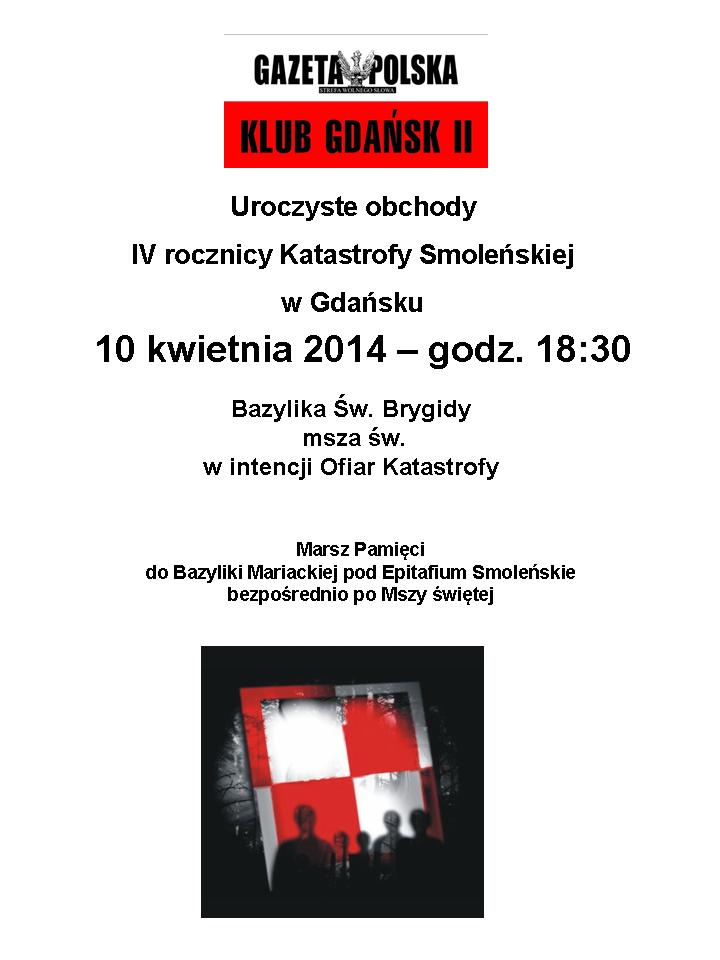 Zapraszamy Was na wspólny marsz z okazji 4 rocznicy Tragedii Smoleńskiej. Zginęli w niej wspaniali patrioci, którzy mogli zrobić jeszcze wiele dobrego dla naszej Ojczyzny.