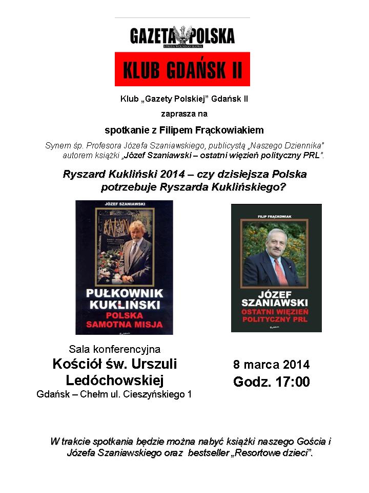 Gdańsk „Ryszard Kukliński 2014 – czy dzisiejsza Polska potrzebuje Ryszarda Kuklińskiego” – 8 marca… Gdańsk II – „Ryszard Kukliński 2014 – czy dzisiejsza Polska potrzebuje Ryszarda Kuklińskiego”, 8 marca, g. 17, sala konferencyjna w Kościele św. Urszuli Ledóchowskiej, Gdańsk Chełm, ul. Cieszyńskiego 1. lut 24, 2014 Kluby GP Gdańsk II Tagged Gdańsk II, Ryszard Kukliński Wstecz 3 dni Niezłomnych w Aleksandrowie Łódzkim – 28.02 – 02.03.14 Dalej 1.03.2014 r. Suwalskie Obchody Święta „Żołnierzy Wyklętych” – Niezłomnych Bohaterów
