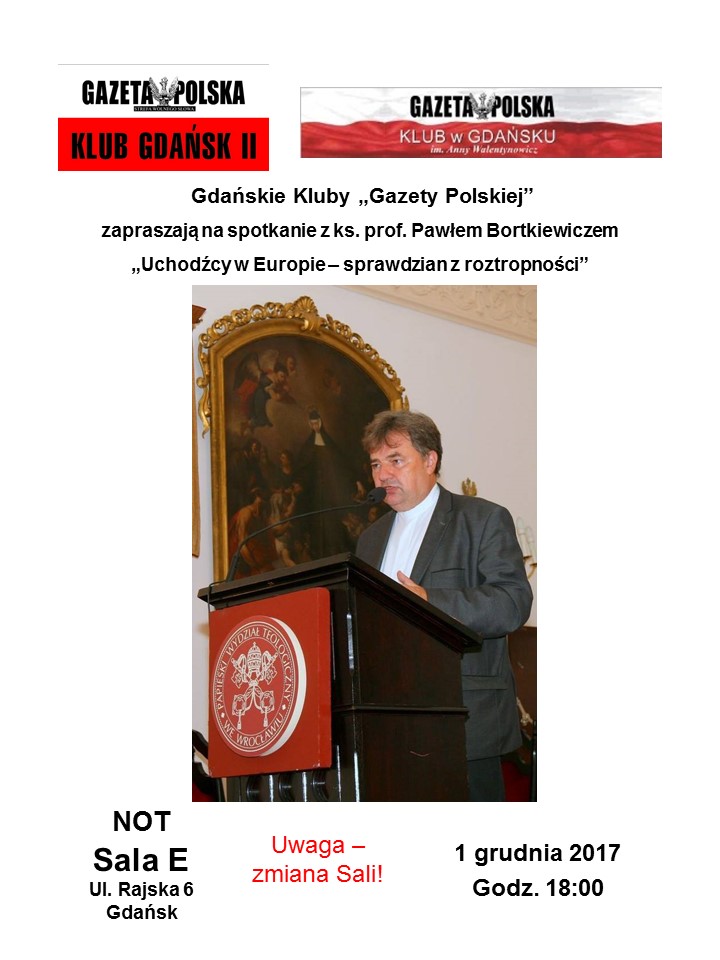 Gdańsk – spotkanie z ks. prof. Pawłem Bortkiewiczem nt. ”Uchodźcy w Europie-sprawdzian z roztropności”, 1 grudnia Gdańsk – spotkanie z ks. prof. Pawłem Bortkiewiczem nt. ”Uchodźcy w Europie-sprawdzian z roztropności”, 1 grudnia, g. 18, NOT Sala E, ul. Rajska 6. Zaprasza Klub „GP” Gdańsk i Gdańsk II. lis 3, 2017 Kluby GP Gdańsk, Gdańsk II Tagged Gdańsk Wstecz Świetna inicjatywa! We Francji powstanie Komitet Obrony Pomników Jana Pawła II Dalej Świętuj z nami w Wilnie – zapisy