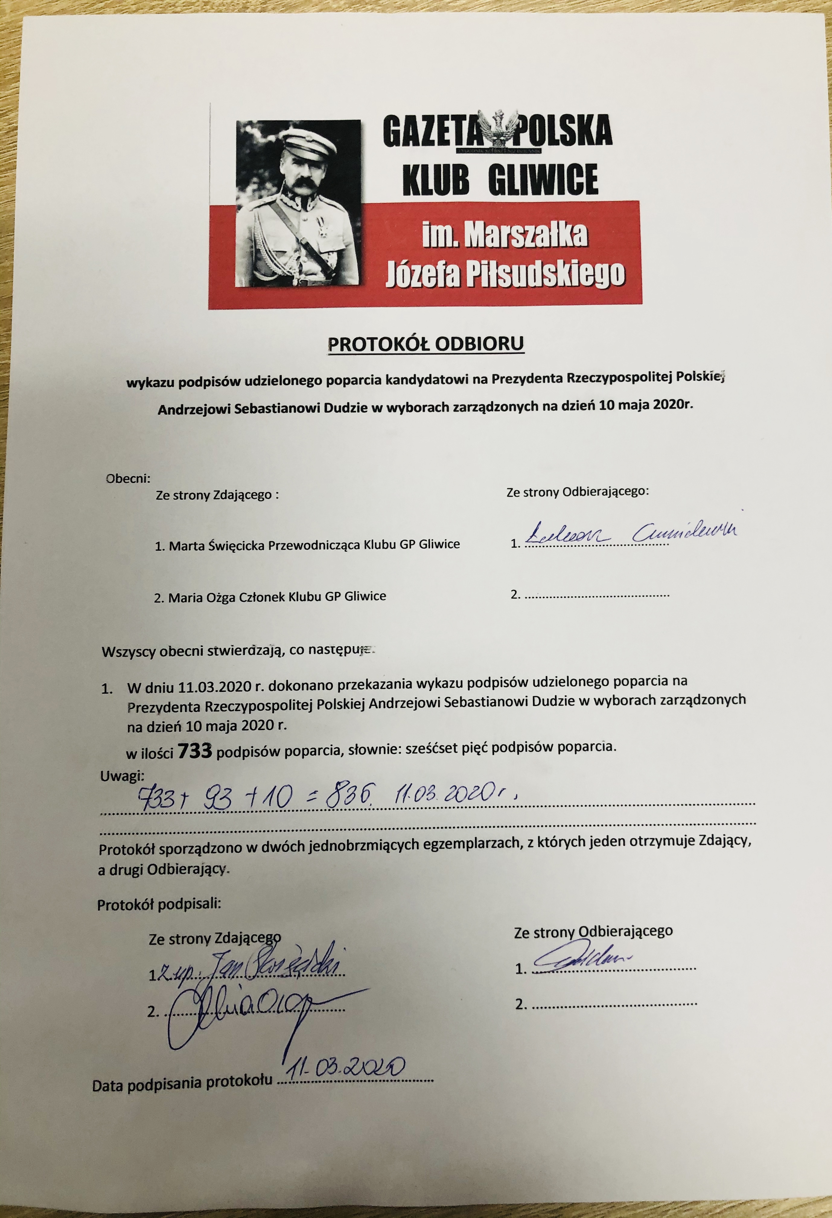 11.03. 2020. Gliwicki Klub Gazety Polskiej do tej pory zebrał 836 podpisów poparcia kandydata Andrzeja Dudy na drugą kadencję prezydencką. Podpisane karty przekazano Łukaszowi Chmielewskiemu, dyrektorowi Biura Poselskiego Prawa i Sprawiedliwości w Gliwicach.