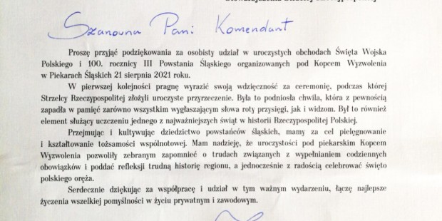 Podziękowania za udział w uroczystych obchodach Święta Wojska Polskiego i 100. rocznicy III Powstania Śląskiego organizowanych pod Kopcem wyzwolenia w Piekarach Śląskich 21 sierpnia 2021 roku.