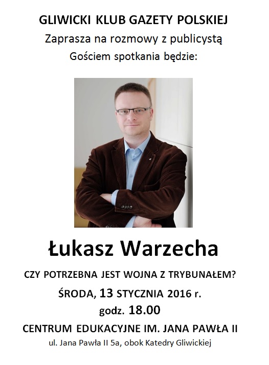 Gliwice – Komunikat: Redaktor Łukasz Warzecha niespodziewanie odwołał przyjazd do Gliwic. Zaplanowane spotkanie i dyskusję na temat: „Czy potrzebna jest wojna z Trybunałem?” poprowadzą przyjaciele naszego Klubu: Blogerka „ESKA”, mec. Stefan Hambura z Berlina i red. Sabina Treffler z Gazety Polskiej Codziennie, 13 stycznia, g. 18, Centrum Edukacyjne im. Jana Pawła II, ul Jana Pawła II 5a – obok katedry gliwickiej.
