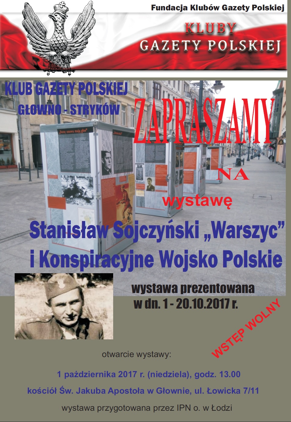 Głowno – Stryków – prezentacja wystawy p.t” Stanisław Sojczyński „Warszyc” i Konspiracyjne Wojsko Polskie”, wystawa prezentowana w dniach 1-20 października. Otwarcie 1 października g. 13, Kościół Św. Jakuba Apostoła w Głownie, ul. Łowicka 7/11. Wystawa przygotowana przez IPN o. w Łodzi. Organizator: Klub „GP” Głowno-Stryków przy współpracy Fundacji Klubów „Gazety Polskiej”.