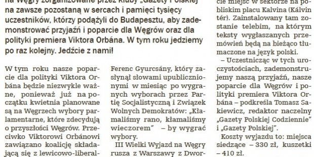 III WIELKI WYJAZD NA WĘGRY \ Już niedługo odbędą się uroczystości upamiętniające rewolucję na Węgrzech w 1848 r. Z tej okazji 15 marca kluby „Gazety Polskiej” po raz trzeci organizują Wielki Wyjazd na Węgry. To ostatnia szansa na zakup biletów i wspólny wyjazd.