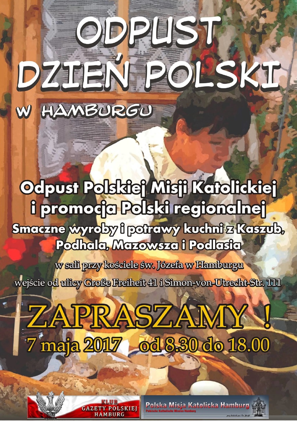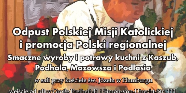 Dnia 07.05.2017 w sali przy kościele Św. Józefa Grosse Freiheit 41 w Hamburgu. KGP Hamburg wspólnie z Polską Misją Katolicką w Hamburgu organizuje ,,Odpust i Dzień Polski w Hamburgu”. Połączony z wystawą ,,od Unii Lubelskiej do Konstytucji 3-go Maja”. Prezentowane będą stoiska z wyrobami i produktami polskiej kuchni regionalnej z Kaszub, Mazowsza, Podhala, Podlasia.