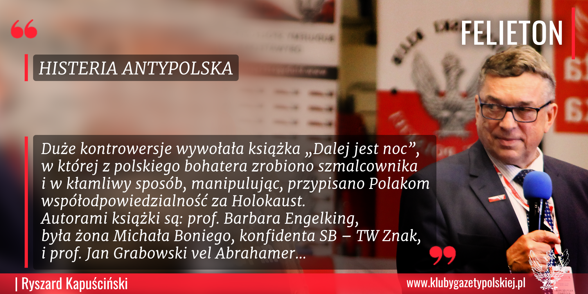 Duże kontrowersje wywołała książka „Dalej jest noc”, w której z polskiego bohatera zrobiono szmalcownika i w kłamliwy sposób, manipulując, przypisano Polakom współodpowiedzialność za Holokaust. Autorami książki są: prof. Barbara Engelking, była żona Michała Boniego, konfidenta SB – TW Znak, i prof. Jan Grabowski vel Abrahamer. Książka jest skandaliczna, wydana za nasze pieniądze przez Centrum Badań nad Zagładą Żydów Polskiej Akademii Nauk. Wyżej wymienieni „naukowcy” od dawna znani są z antypolskiej retoryki. Warto przypomnieć haniebną konferencję, która się odbyła dwa lata temu w Paryżu (zorganizowaną m.in. przez PAN), zatytułowaną „Nowa polska szkoła historii Holokaustu”. Prelegentami byli m.in. Jan Grabowski, Jan Tomasz Gross, Barbara Engelking i Joanna Tokarska-Bakir, która w wywiadzie dla niemieckiej Fundacji Gerdy Henkel, założonej przez siostrę Josta Henkela, niemieckiego przedsiębiorcy, który pomógł Hitlerowi dojść do władzy, obarczyła polskich cywilów winą za pogrom na Żydach w Kielcach w 1946 r. Światowe Porozumienie Polskich Patriotów wystosowało wtedy list otwarty do polskich władz, w którym zaprotestowało przeciwko tak jednostronnemu doborowi prelegentów. I co? I nic!
