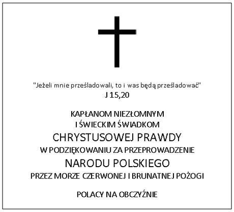 Wiara katolicka jest fundamentem na którym tworzyła się przez wieki polska tożsamość, a Kościół umacniał ten fundament i jedność duchową Polaków. Zawsze w trudnych momentach naszych dziejów za pośrednictwem kapłanów naród polski zwracał się o pomoc i ratunek do Pana Boga i Matki Przenajświętszej, a wsparcie z Nieba utwierdzało nas w przekonaniu, że dobrze lokujemy nasze nadzieje. Obecność kapłanów w szeregach walczących żołnierzy i konspiratorów oraz współuczestnictwo w tej walce pozwalały Polakom nie zapomnieć że dzięki sile ducha, dzięki