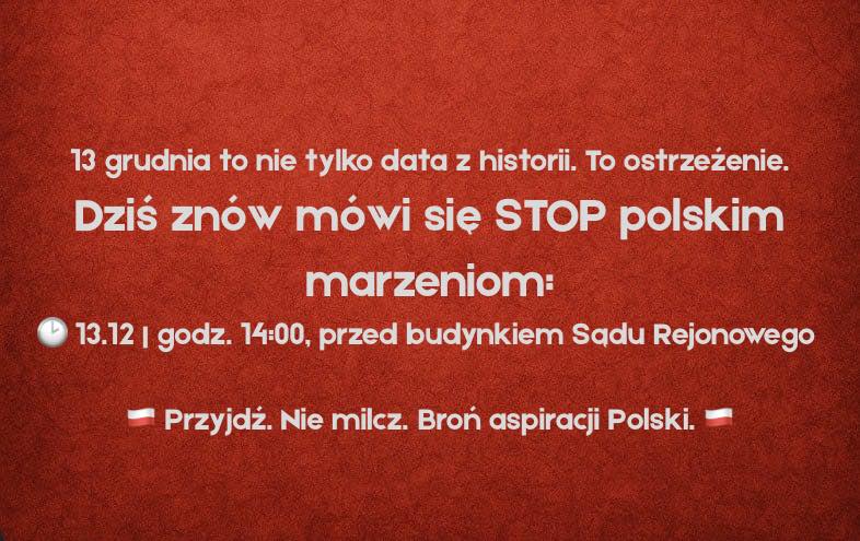 Ta sama władza powiedziała STOP marzeniom i aspiracjom Polaków – nie dla atomu, nie dla portów, nie dla spławnej Odry, nie dla innowacji w instytucie Łukaszewicza, nie dla centrum symulacji nuklearnych, nie dla naszych aspiracji, których symbolem stało się CPK. Ciężko, nam obywatelom milczeć. Wraz z odzyskaniem niepodległości w Polsce dorastały pokolenia nie obarczone komunizmem, zaczęły one marzyć bez kompleksów, sny ich rodziców stawały się rzeczywistością, pokolenia które uwierzyły, że Polska może być Wielką, nie tylko dumą ze swojej przeszłości, ale wielką realizowanymi projektami, wielką swoim rozwojem, nie chcemy by kolejny raz data 13 grudnia kojarzyła się z odebraniem marzeń milionom Polaków.