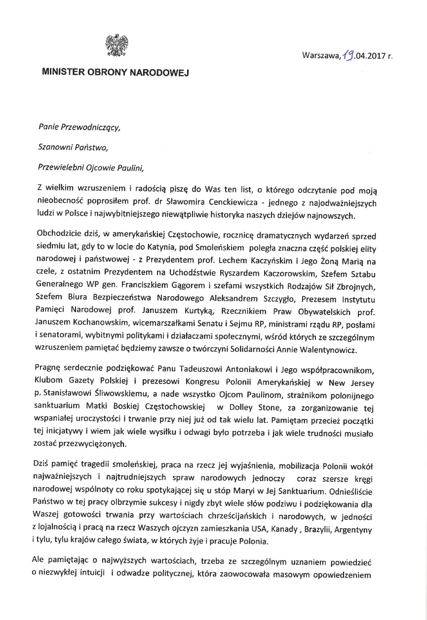 22 i 23 kwietnia w Amerykańskiej Częstochowie w Doylestown, w stanie Pennsylvania, odbyła się IV Konferencja Polonijna połączona z uroczystościami upamiętnienia katastrofy w Smoleńsku. List do uczestników skierował szef MON Antoni Macierewicz. „Dziś pamięć tragedii smoleńskiej, praca na rzecz jej wyjaśnienia, mobilizacja Polonii wokół najważniejszych i najtrudniejszych spraw narodowych jednoczy coraz szersze kręgi narodowej wspólnoty co roku spotykającej się u stóp Maryi w Jej Sanktuarium” – napisał szef resortu obrony.