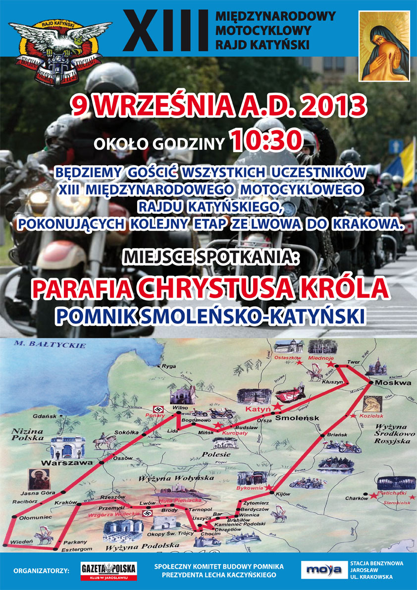 Jarosław – spotkanie z uczestnikami XIII Międzynarodowego Motocyklowego Rajdu Katyńskiego, 9 września, g. 10.30 w Kościele pw. Chrystusa Króla. Organizatorzy: Społeczny Komitet Budowy Pomnika Prezydenta L. Kaczyńskiego i Klub „Gazety Polskiej” w Jarosławiu.
