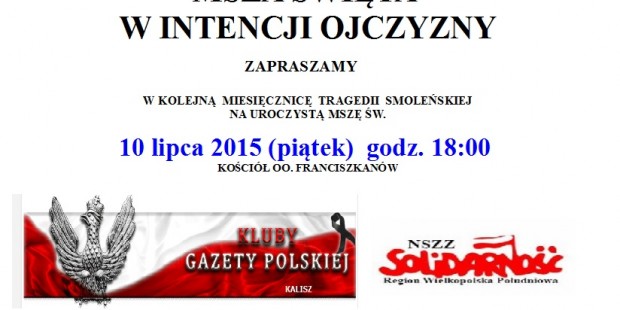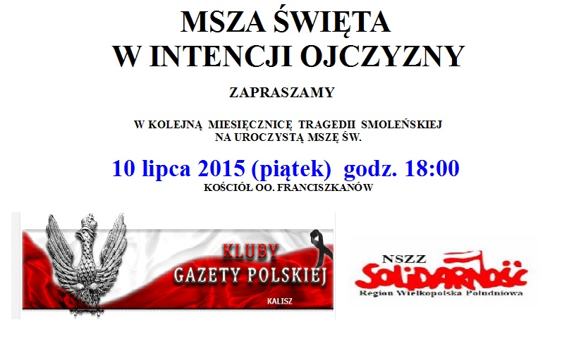 Kalisz – miesięcznica tragedii smoleńskiej, Msza Św. w intencji Ojczyzny, 10 lipca Kaliski Klub Gazety Polskiej ZAPRASZA W KOLEJNĄ MIESIĘCZNICĘ TRAGEDII SMOLEŃSKIEJ NA UROCZYSTĄ MSZĘ ŚW. W INTENCJI OJCZYZNY 10 lipca 2015 (piątek) godz. 18:00 KOŚCIÓŁ OO. FRANCISZKANÓW (Prosimy o przyniesienie zniczy) lip 1, 2015 Kluby GP Kalisz Tagged Kalisz, Marsz, Miesięcznice, Obchody, Tragedia Smoleńska Wstecz Hamburg – spotkanie na temat „Golgota Polskiego Duchowieństwa”, 12 lipca Dalej Gdańsk – Rocznica Czarniej Niedzieli na Wołyniu, 11 lipca