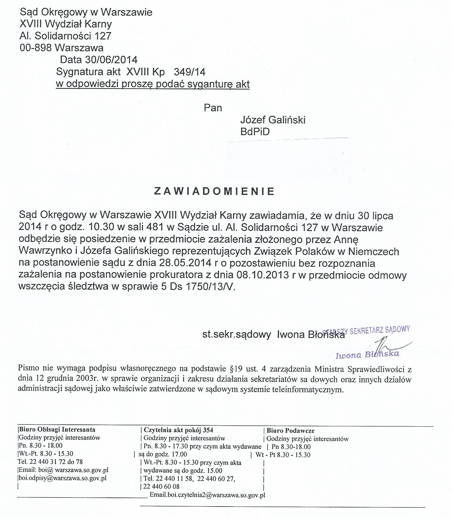 27 sierpnia, g. 11.30 sala 481, w sądzie przy Al. Solidarności 127.