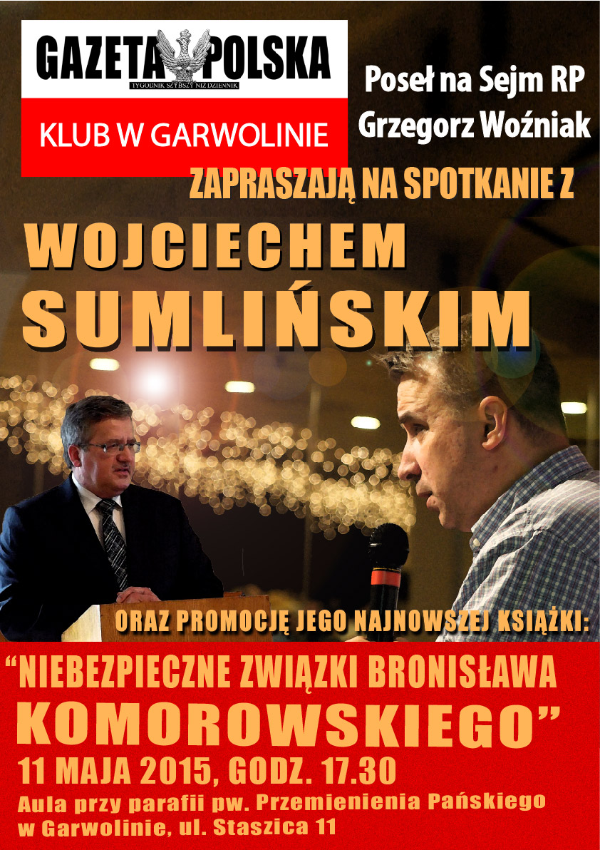 Czytaj więcej →Garwolin – spotkanie z red. Wojciechem Sumlińskim oraz promocja książki „Niebezpieczne związki Bronisława Komorowskiego”, 11 maja, g. 17.30, Aula przy parafii pw. Przemienienia Pańskiego, ul. Staszica 1.