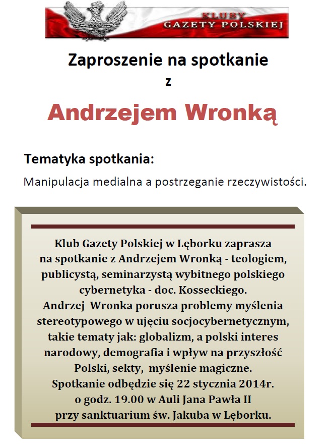 Lębork – spotkanie z Andrzejem Wronką nt.” Manipulacja medialna a postrzeganie rzeczywistości”, 22 stycznia, g. 19, Aula Jana Pawła II przy sanktuarium św. Jakuba.