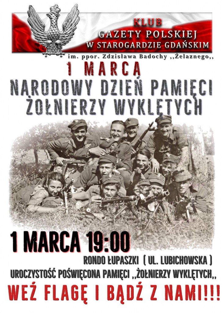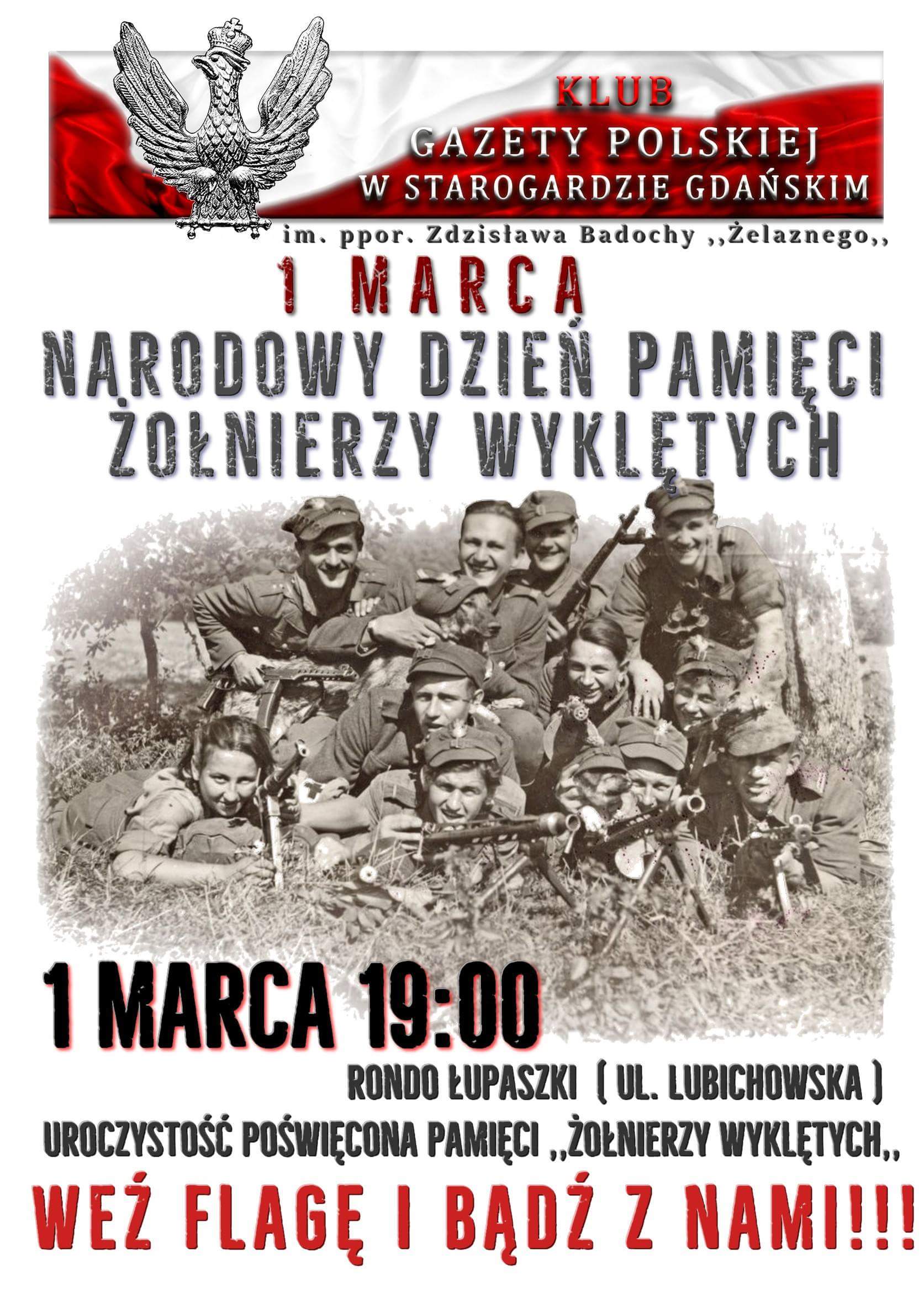 Narodowy Dzień Żołnierzy Wyklętych, został uczczony przez Klub Gazety Polskiej Stargard Gdański na rondzie mjr Zygmunta Szendzielarza ” Łupaszki”. Pomimo siarczystego mrozu w wydarzeniu wzięło udział ok 200 osób.