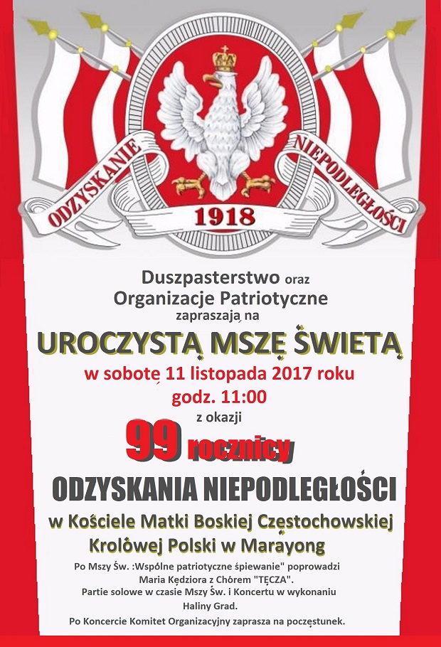 Czytaj więcej →Marayong – uroczysta Msza św. w 99 rocznicę odzyskania Niepodległości, 11 listopada, g. 11, w Kościele Matki Boskiej Częstochowskiej Królowej Polski. Po Mszy św. wspólne patriotyczne śpiewanie.