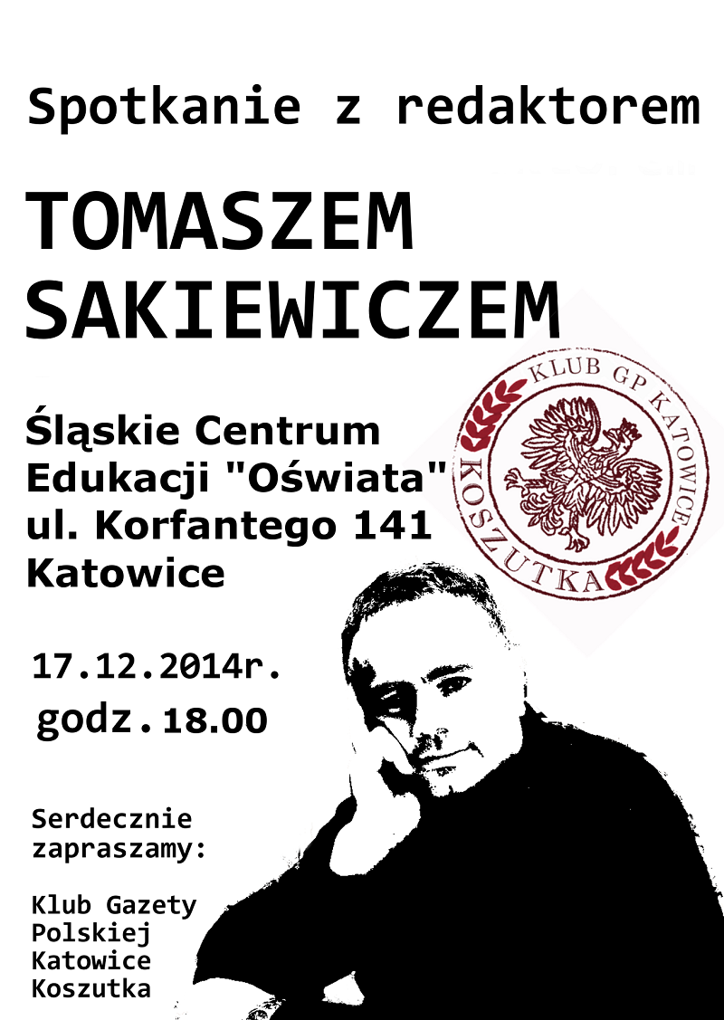 Klub Gazety Polskiej Katowice Koszutka ma zaszczyt zaprosić Państwa na spotkanie autorskie z redaktorem Gazety Polskiej Tomaszem Sakiewiczem, które odbędzie się 17.12.2014 o godz. 18.00 w Śląskim Centrum Edukacji „Oświata” ul. Korfantego 141 (szary budynek) w Katowicach. Spotkanie jest organizowane we współpracy z Klubami GP Ruda Śląska i Knurowa.