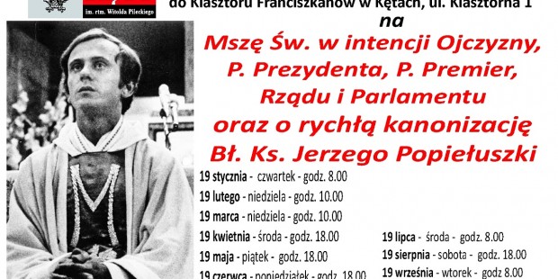 Kęty – Msze św. w intencji Ojczyzny, Prezydenta, Premier, Rządu, Parlamentu oraz o rychłą kanonizację Bł. Ks. Jerzego Popiełuszki,  Klasztor Franciszkanów, ul. Klasztorna 1.