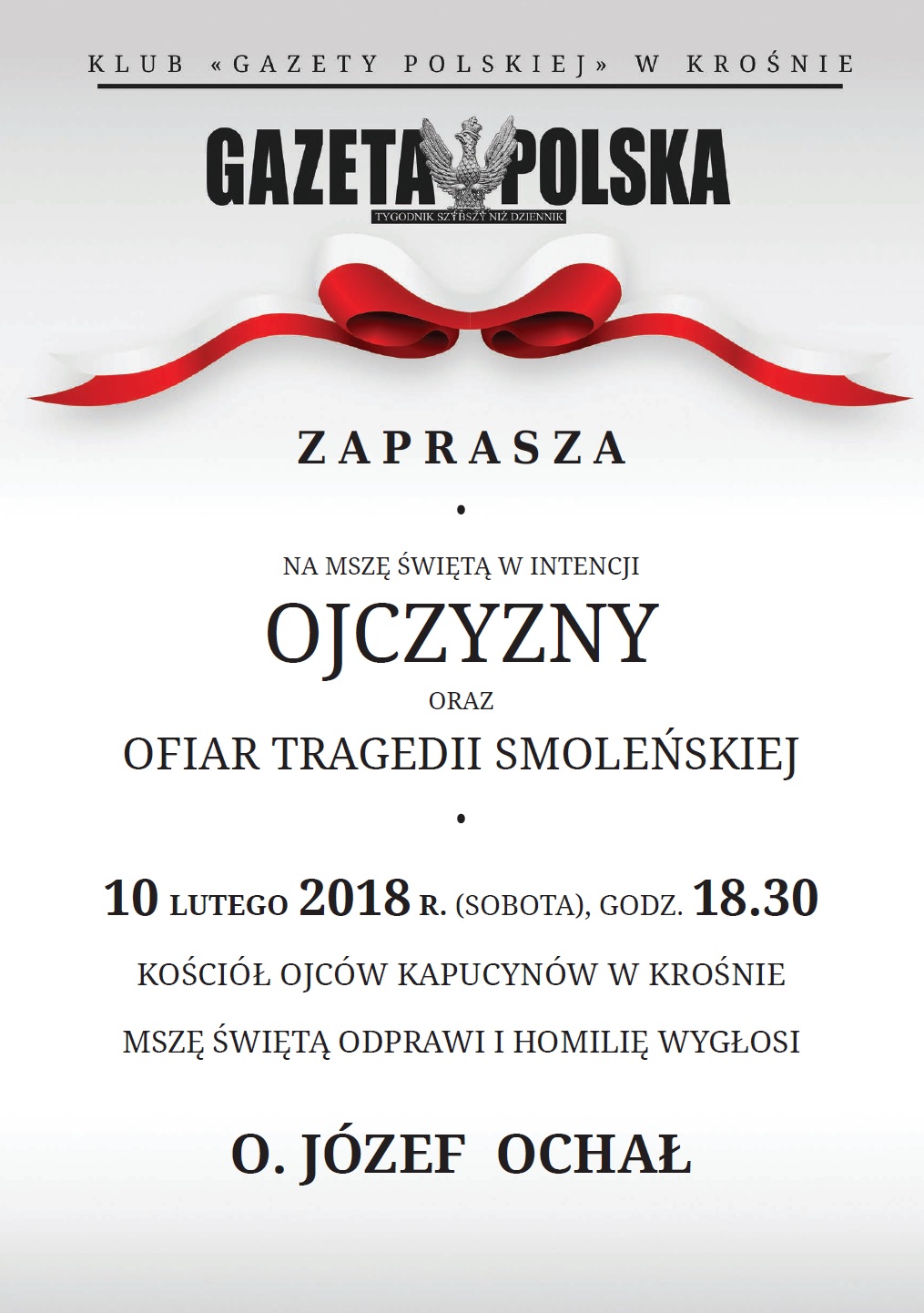 Klub Gazety Polskiej w Krośnie zaprasza na Mszę św. w intencji Ojczyzny i ofiar tragedii smoleńskiej w dniu 10.02.2018 o godz. 18.30 do kościoła Ojców Kapucynów w Krośnie.