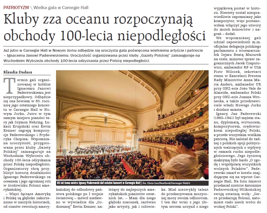 Termin gali organizowanej w hołdzie Ignacemu Janowi Paderewskiemu jest nieprzypadkowy. Odbędzie się ona bowiem w 85. rocznicę jego ostatniego koncertu w Carnegie Hall w Nowym Jorku. Jutro w tym samym miejscu pianiści tacy jak Szymon Nehring, Łukasz Krupiński oraz Kevin Kenner zagrają kompozycje Paderewskiego i Fryderyka Chopina. Wspomniana uroczystość, przygotowana przez kluby „Gazety Polskiej” zainauguruje na Wschodnim Wybrzeżu obchody 100-lecia odzyskania przez Polskę niepodległości. Organizatorzy chcą przybliżyć historię działalności Ignacego Paderewskiego za oceanem i jego ogromnej roli w środowisku Polonii amerykańskiej.