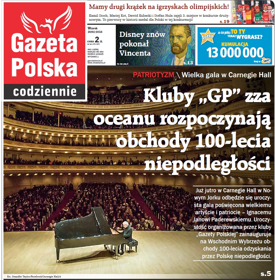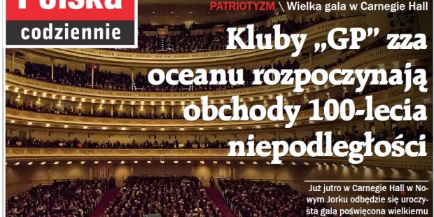 Już jutro w Carnegie Hall w Nowym Jorku odbędzie się uroczysta gala poświęcona wielkiemu artyście i patriocie – Ignacemu Janowi Paderewskiemu. Uroczystość organizowana przez kluby „Gazety Polskiej” zainauguruje na Wschodnim Wybrzeżu obchody 100-lecia odzyskania przez Polskę niepodległości.