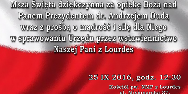 Wspólna  modlitwa w intencji Pana Prezydenta dr. Andrzeja Dudy, podczas Mszy Św. 25. IX, godz. 12:30, w kościele pw. Najświętszej Marii Panny z Lourdes.