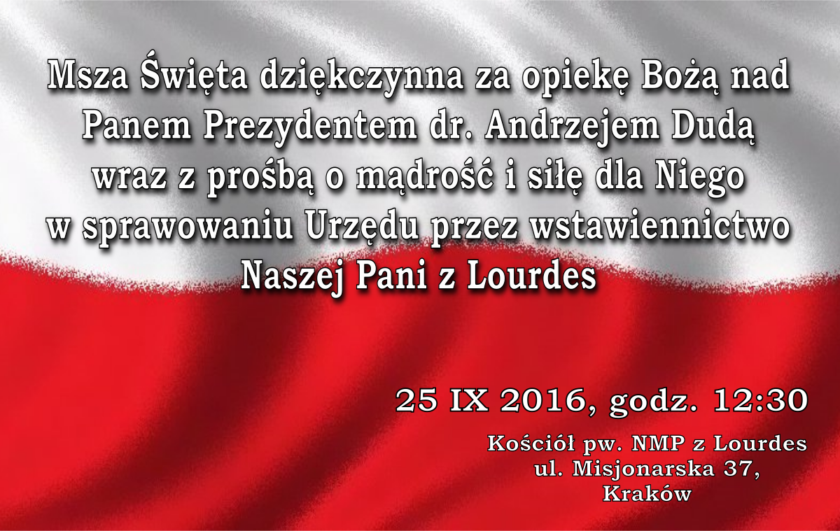 Msza Św. dziękczynna za opiekę Bożą nad Panem Prezydentem dr. Andrzejem Dudą wraz z prośbą o mądrość i siłę dla Niego w sprawowaniu Urzędu  a także za naszych Nieprzyjaciół o łaskę Pokoju przez wstawiennictwo Naszej Pani z Lourdes