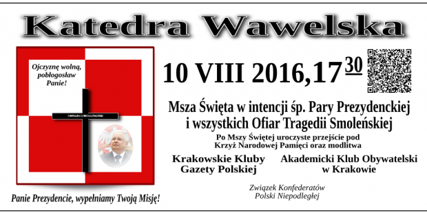 Kraków – miesięczna tragedii smoleńskiej, 10 sierpnia, g. 17.30, Msza św. w intencji śp. Pary Prezydenckiej i wszystkich Ofiar Tragedii Smoleńskiej w Katedrze Wawelskiej. Po Mszy św. uroczyste przejście pod Krzyż Narodowej Pamięci oraz modlitwa.