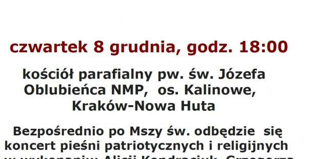 Bezpośrednio po Mszy św. odbędzie się koncert pieśni patriotycznych i religijnych w wykonaniu: Alicji Kondraciuk, Grzegorza Kowalskiego i Marzeny Kubin.