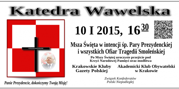 Kraków – Msza św. w intencji śp. Pary Prezydenckiej i wszystkich Ofiar Tragedii Smoleńskiej, 10 stycznia Kraków – Msza św. w intencji śp. Pary Prezydenckiej i wszystkich Ofiar Tragedii Smoleńskiej, 10 stycznia, g. 16.30, Katedra Wawelska. Po Mszy uroczyste przejście pod Krzyż Narodowej Pamięci oraz modlitwa. sty 5, 2015 Kluby GP Kraków, Kraków - Klub Młodych "GP", Kraków - Nowa Huta Tagged Kraków, Marsz, Miesięcznice, Obchody, Tragedia Smoleńska Wstecz Ciechanów – spotkanie z prof. Krzysztofem Szwagrzykiem, 9 stycznia Dalej Klub GP Katowice Koszutka- terminy spotkań.