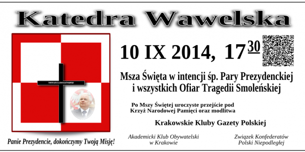 Kraków – Msza św. w intencji śp. Pary Prezydenckiej i wszystkich Ofiar Tragedii Smoleńskiej, 10 września, Kraków – Msza św. w intencji śp. Pary Prezydenckiej i wszystkich Ofiar Tragedii Smoleńskiej, 10 września, g. 17.30, Katedra Wawelska. Po Mszy uroczyste przejście pod Krzyż Narodowej Pamięci oraz wykład senatora Bogdana Pęka. wrz 9, 2014 Kluby GP Kraków Tagged Kraków, Marsz, Miesięcznice, Obchody, Tragedia Smoleńska Wstecz Opole – 75. Rocznica napaści wojsk sowieckich na Polskę, 17 września Dalej [Tydzień w Klubach „GP”] Pamięć o 1 września