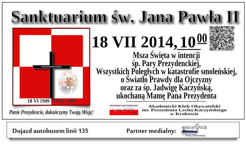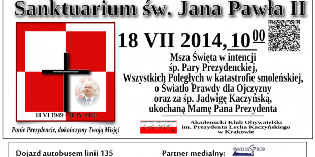 Kraków – Msza św. w intencji śp. Pary Prezydenckiej oraz wszystkich Ofiar tragedii smoleńskiej oraz za śp. Jadwigę Kaczyńską, 18 lipca, g. 10, Sanktuarium św. Jana Pawła II.