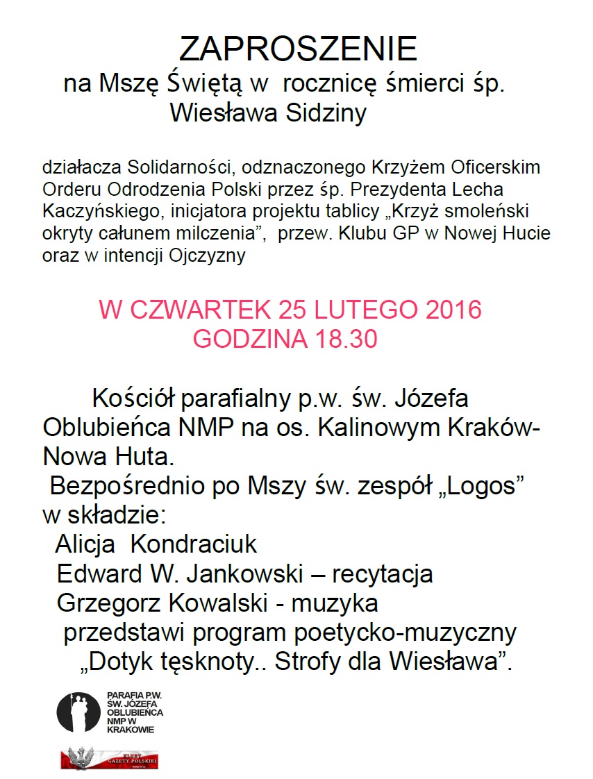działacza Solidarności, odznaczonego Krzyżem Oficerskim Orderu Odrodzenia Polski przez śp. Prezydenta Lecha Kaczyńskiego, inicjatora projektu tablicy „Krzyż smoleński okryty całunem milczenia”, przew. Klubu GP w Nowej Hucie oraz w intencji Ojczyzny