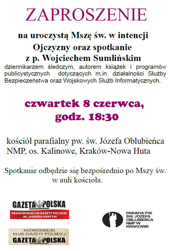 Zapraszamy na uroczystą Mszę św. w intencji Ojczyzny oraz spotkanie z p. Wojciechem Sumlińskim dziennikarzem śledczym, autorem książek i programów publicystycznych dotyczących m.in. działalności Służby Bezpieczeństwa oraz Wojskowych Służb Informatycznych.
