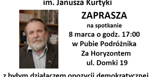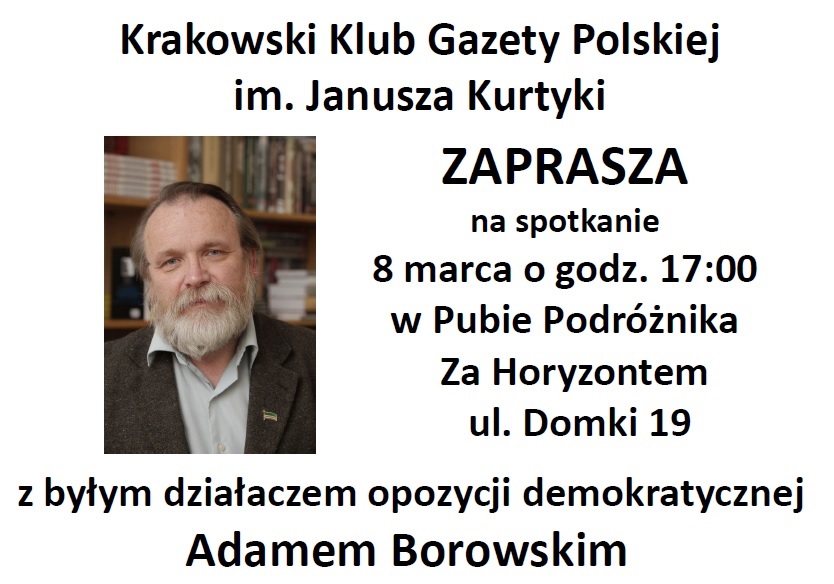 Kraków – spotkanie z Adamem Borowskim, opozycjonistą „Solidarności”, 8 marca Kraków – spotkanie z Adamem Borowskim, opozycjonistą „Solidarności”, 8 marca, g. 17, do Pubu „Za Horyzontem” ul. Domki 19. mar 6, 2017 Kluby GP Kraków Tagged Kraków Wstecz Gorzyce – spotkanie z Tadeuszem Płużańskim, 19 marca Dalej Gdynia – spotkanie z Jerzym Jachowiczem dziennikarzem śledczym, autorem książki „Skamieliny III RP. Nomenklatura wiecznie żywa”, 11 marca