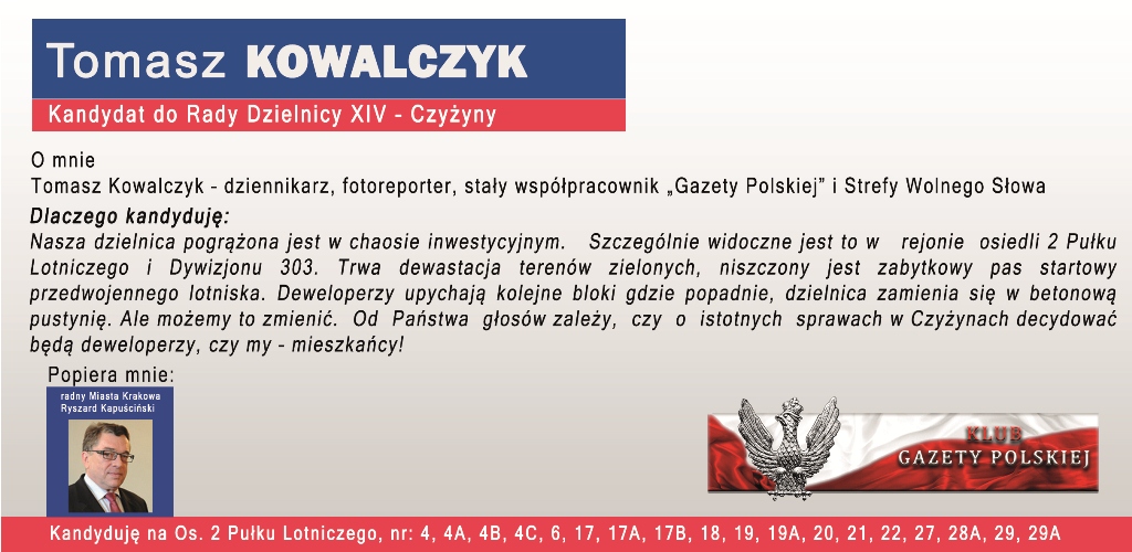 [Kraków] Tomasz Kowalczyk – kandydat do Rady Dzielnicy [Kraków] Tomasz Kowalczyk – kandydat do Rady Dzielnicy lis 10, 2014 Kluby GP Kraków Tagged Kraków, PIS, wybory Wstecz [Limanowa] Stefan Hutek – kandydat do Rady Powiatu Dalej [Koszalin] Bożena Tacher – kandydatka to Rady Miasta