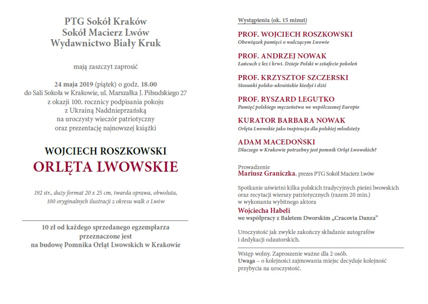 KRAKÓW – uroczysty wieczór patriotyczny z okazji 100 rocznicy podpisania pokoju z Ukrainą Naddnieprzańską oraz prezentację najnowszej książki prof. Wojciecha Roszkowskiego pt. „Orlęta Lwowskie”, 24 maja