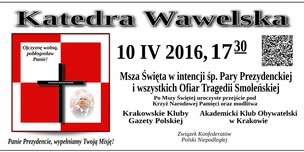 Kraków – VI rocznica tragedii smoleńskiej, 10 kwietnia, g. 17.30, Msza św. w intencji śp. Pary Prezydenckiej i wszystkich Ofiar Katynia w Katedrze Wawelskiej. Po Mszy św. uroczyste przejście pod Krzyż Narodowej Pamięci oraz modlitwa.
