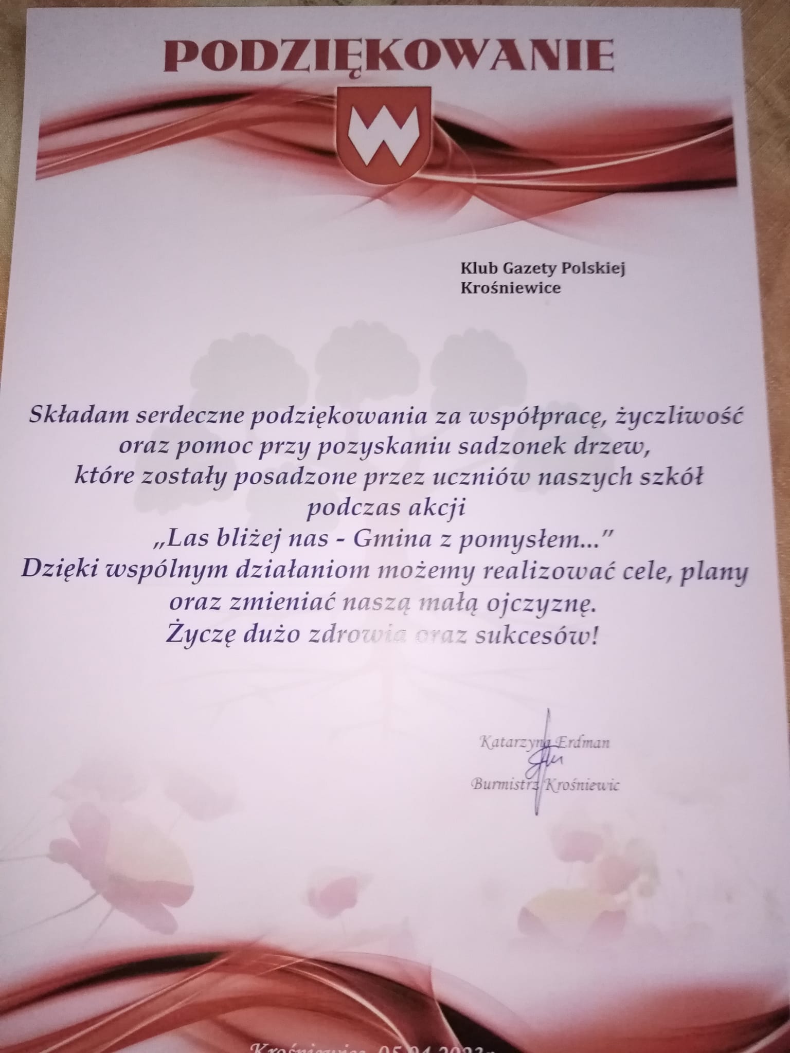 „Gmina z pomysłem” i „Las bliżej nas” pod takimi hasłami odbyła się akcja sadzenia drzew na terenie szkoły. Inicjatorem akcji był Klub Gazety Polskiej Krośniewice we współpracy z Nadleśnictwem Kutno. Teren naszej szkoły urozmaicą drzewa takie jak: świerki, brzozy i jarzębiny.