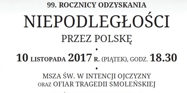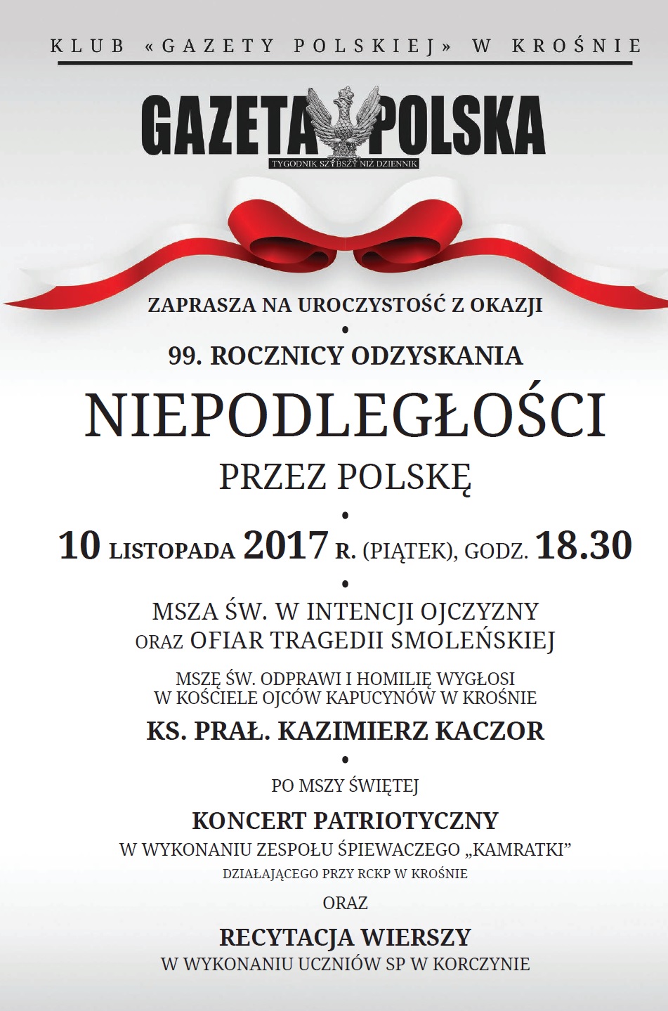 Klub Gazety Polskiej w Krośnie zaprasza na uroczystość z okazji 99 rocznicy odzyskania niepodległości przez Polskę. Msza św. w intencji Ojczyzny oraz ofiar tragedii smoleńskiej zostanie odprawiona w dniu 10 listopada o godz. 18.30 w kościele Ojców Kapucynów w Krośnie. Mszę św. odprawi i homilię wygłosi ks. prał. Kazimierz Kaczor, po której odbędzie si ę koncert patriotyczny w wykonaniu zespołu śpiewaczego „KAMRATKI” oraz recytacja wierszy w wykonaniu uczniów Szkoły Podstawowej w Korczynie.