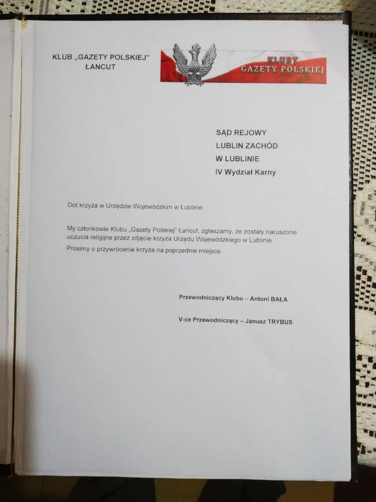 Klub „Gazety Polskiej” Łańcut przed Sądem w Lublinie po kolejnej wokandzie przeciwko Wojewodzie za zdjęcie Krzyża.