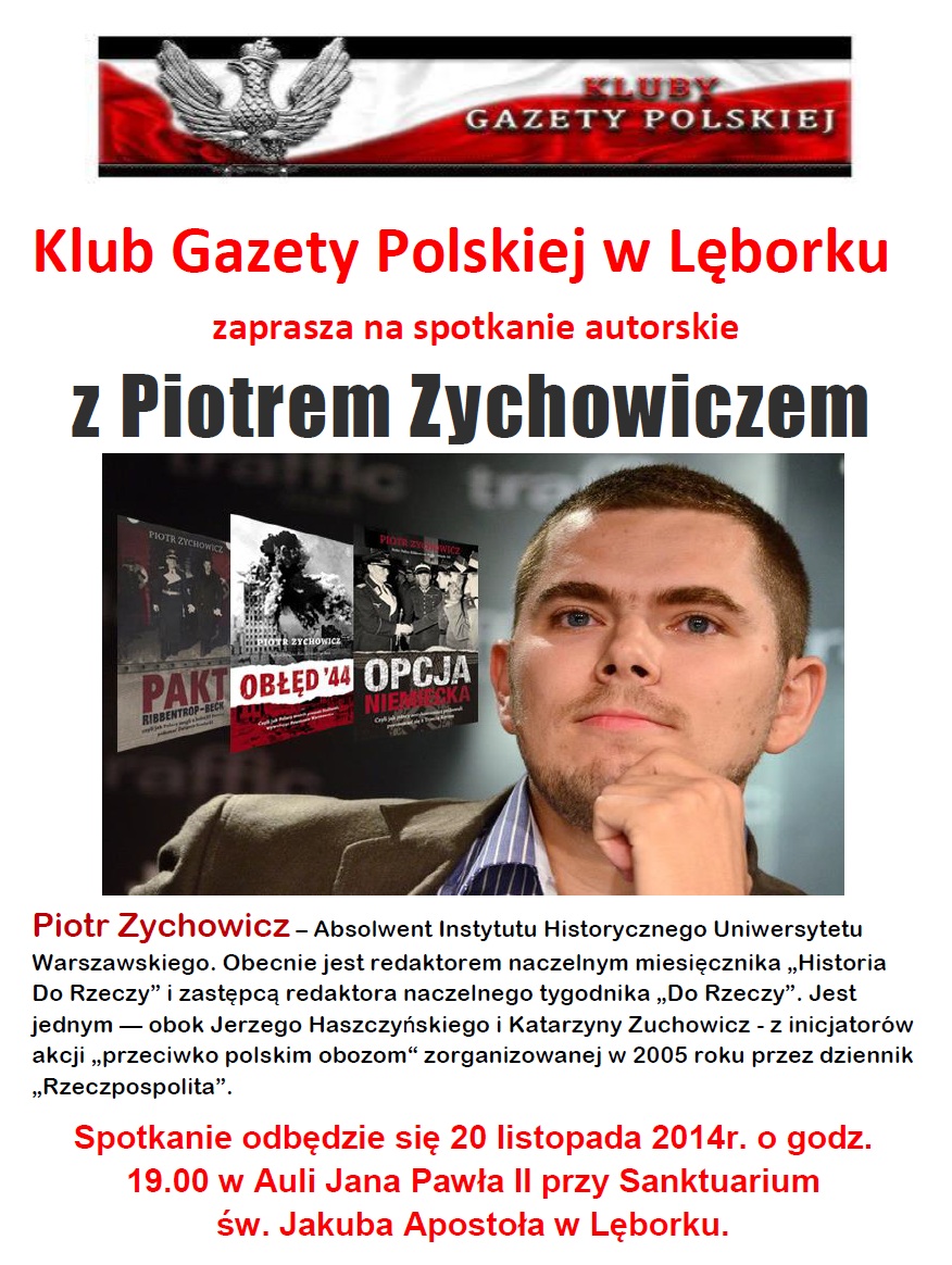 Lębork – spotkanie z Piotrem Zychowiczem, 20 listopada, g. 19 w Auli Jana Pawła II przy Sanktuarium św. Jakuba Apostoła.