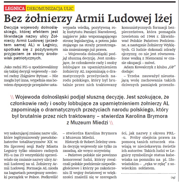 \\ Wojewoda dolnośląski podjął słuszną decyzję. Jest szokujące, że  członkowie rady i osoby lobbujące za upamiętnieniem żołnierzy AL zapominają o dramatycznych przeżyciach narodu polskiego, który był brutalnie przez nich traktowany – stwierdza Karolina Brymora z Muzeum Miedzi \\