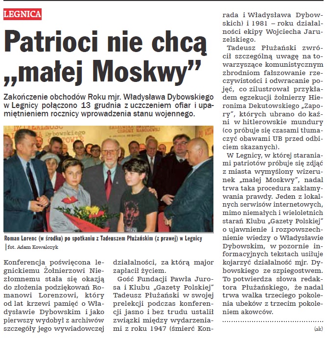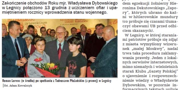 W Legnicy, w której staraniami patriotów próbuje się zdjąć z miasta wymyślony wizerunek „małej Moskwy”, nadal trwa taka procedura zakłamywania prawdy. Jeden z lokalnych serwisów internetowych, mimo niemałych i wieloletnich starań Klubu „Gazety Polskiej” o ujawnienie i rozpowszechnienie wiedzy o Władysławie Dybowskim, w pozornie informacyjnych tekstach usiłuje kojarzyć działalność mjr. Dybowskiego ze szpiegostwem. To potwierdza słowa redaktora Płużańskiego, że nadal trwa walka trzeciego pokolenia ubeków z trzecim pokoleniem akowców.